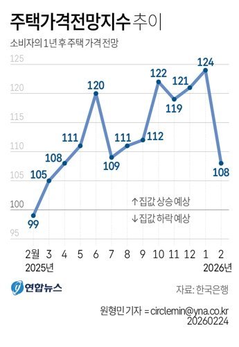 주택 소비자들의 집값 상승 기대감이 최근 뚜렷하게 낮아지고 있다. 한국은행이 24일 발표한 소비자동향조사에 따르면 2월 주택가격전망지수는 108로 전월보다 16p 하락했다. 이 하락 폭은 2022년 7월 이후 3년7개월 만에 가장 큰 것이다. 향후 1년 뒤 집값이 떨어질 것이라고 보는 응답이 그만큼 늘었다는 의미다. 시장의 방향을 가늠하는 심리지표에 분명한 변화가 나타난 셈이다.