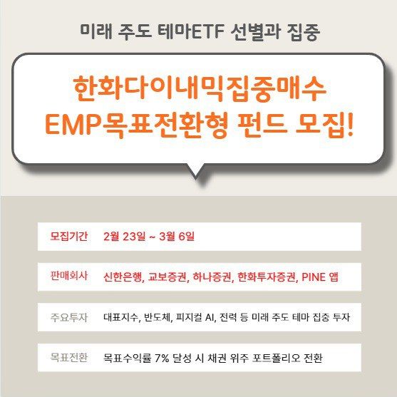 한화다이내믹집중매수EMP목표전환형 펀드는 모집 기간이 정해진 폐쇄형 펀드로, 다음 달 6일까지 신한은행, 교보증권, 하나증권, 한화투자증권, 한화자산운용 파인(PINE) 앱에서 가입 가능하다. 최종 모집된 금액으로 펀드가 조성돼 3월 9일 설정 예정이다.