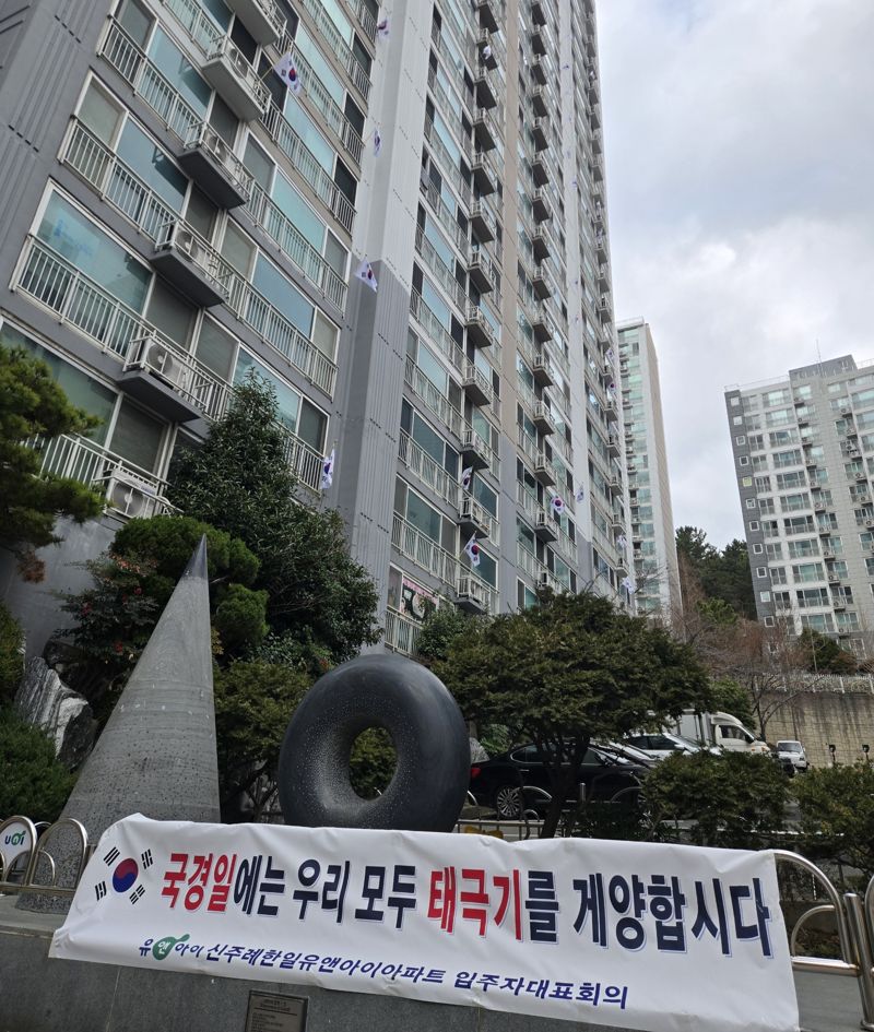아파트 측은 이날 삼일절을 맞아 전달받은 태극기를 베란다 등에 걸어둘 것을 요청하는 방송을 하루 전날에 했다. 기부일 이후로 맞는 첫 국경일이기 때문이다.