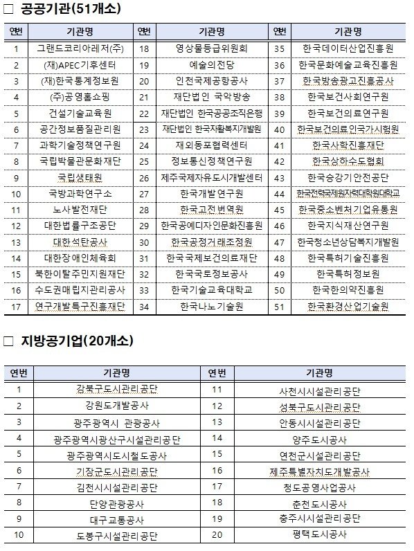 한편 정부가 공개한 미이행 기관 명단에는 인천국제공항공사, 국방과학연구소, 한국개발연구원(KDI), 한국국토정보공사, 한국승강기안전공단, 한국환경산업기술원, 대한석탄공사, 제주국제자유도시개발센터 등 비교적 규모가 크거나 대외 인지도가 높은 기관들도 포함됐다. 이 밖에도 그랜드코리아레저, 예술의전당, 한국데이터산업진흥원, 한국전력국제원자력대학원대학교 등 다양한 공공기관이 명단에 이름을 올렸다.