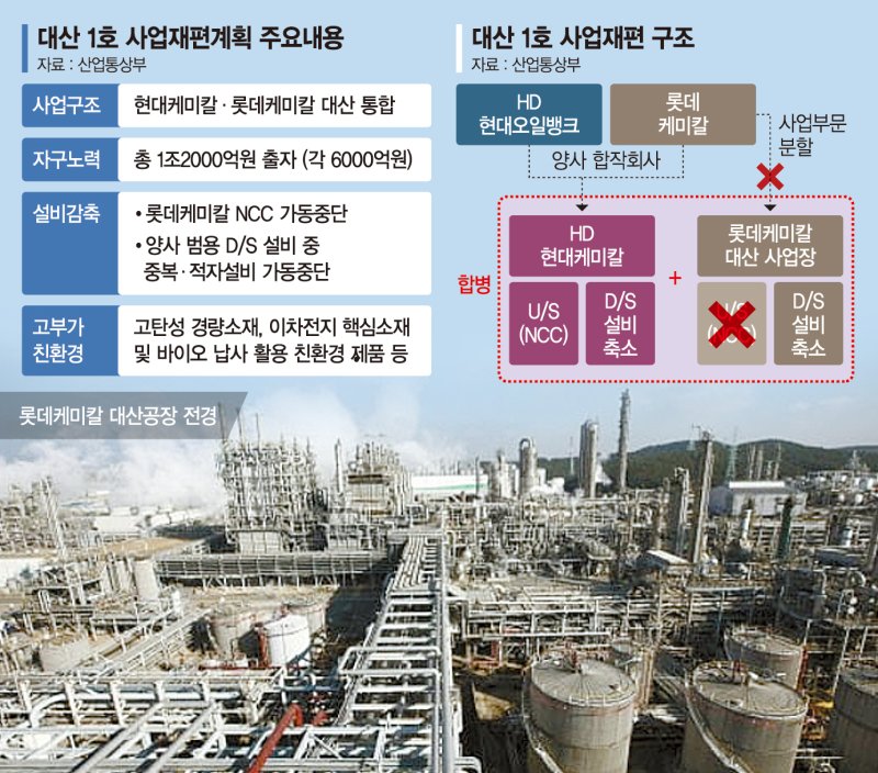 이에 롯데케미칼은 충남 대산 사업장을 물적 분할한 뒤 HD현대케미칼 대산 사업장과 합병해 통합 신설법인을 설립한다.