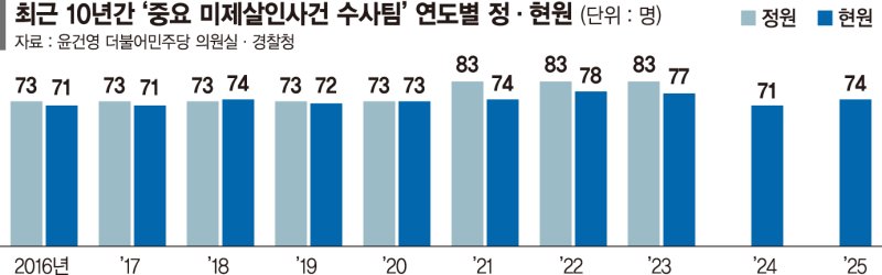 다만 현재 인력 규모로는 수사 난도가 높은 미제살인사건을 감당하기엔 충분치 않다는 지적이 나온다. 최근 10년간 각 시·도청 중요 미제살인사건 수사팀 인원은 매년 70명대에 머물렀다. 전국 17개 시·도청 인원을 모두 합한 수치임을 고려하면, 시·도청 한 곳당 미제살인사건을 담당하는 경찰은 평균 4명에 불과한 셈이다.