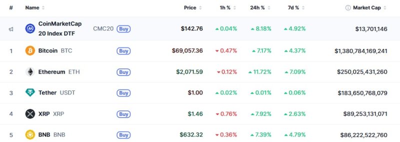 26일 오전 5시 현재 글로벌 코인 시황 중계사이트 코인마켓캡에서 비트코인은 24시간 전보다 7.17% 급등한 6만9057달러를 기록, 6만9000달러를 회복했다. 비트코인은 한때 6만9540달러까지 치솟았었다.