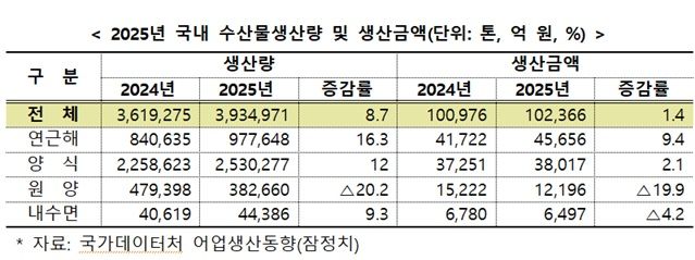 부문별로는 연근해어업과 해면양식업이 전체 생산량 증가를 이끌었다.