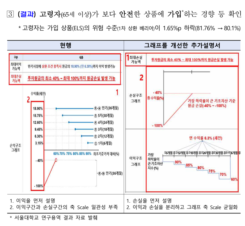 최 교수팀은 지난해 8월부터 10월까지 시중은행 ELS 판매 점포 60개를 방문한 소비자 2227명을 대상으로 시범사업을 실시했다. 그 결과에 따르면 손실과 이익그래프를 분리하고 손실을 먼저 설명하는 것으로 개선했을 때, 65세 이상 고령층의 가입상품 위험수준(1차 상환 베리어)이 기존 81.76%에서 80.1%로 1.65%p 하락했다.