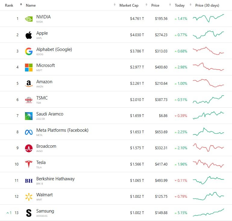 이제 삼성전자 앞에는 엔비디아, 애플, 알파벳, 마이크로소프트, 아마존, 대만 TSMC, 사우디 아람코, 메타, 브로드컴, 테슬라, 버크셔 해서웨이, 월마트가 있을 뿐이다.
