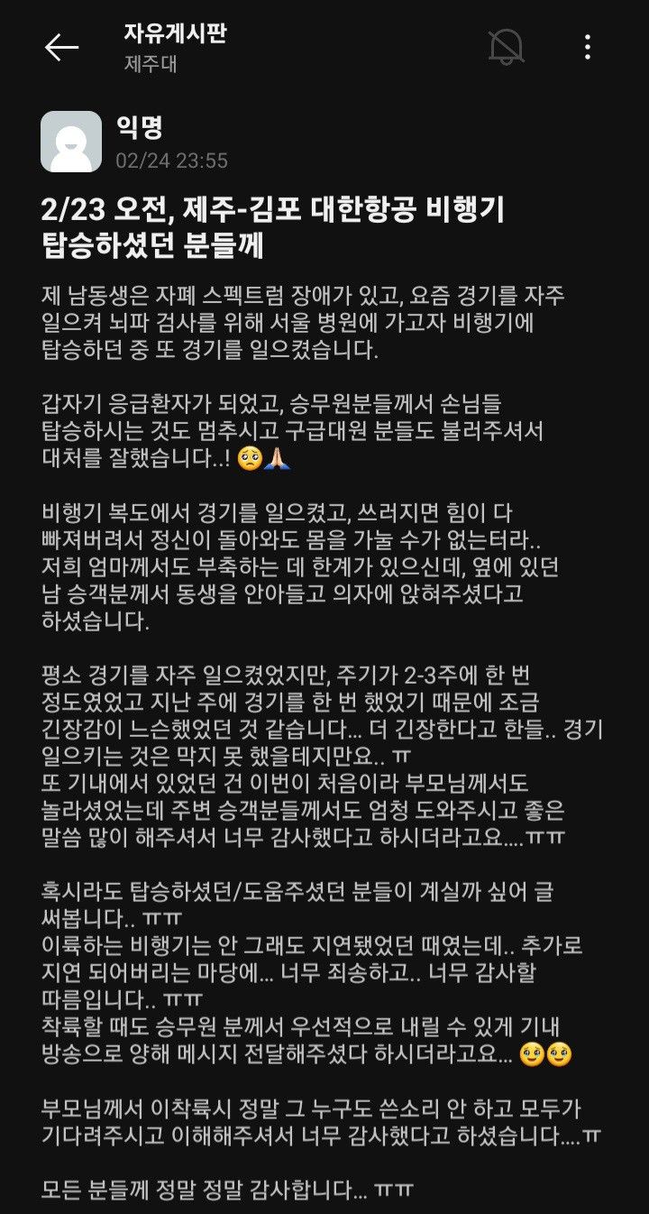 남동생이 기내에서 발작을 일으킨 것은 처음이었던 터라 부모님도 적잖이 당황했었다. 하지만 주변 승객들의 도움과 따뜻한 말 한마디에 부모님은 큰 위안을 얻었다.