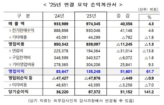 26일 한전이 발표한 결산실적(잠정)에 따르면 연결기준 매출액은 97조 4345억원, 영업비용은 83조 9097억원이며, 영업이익은 전년 대비 5조 1601억원 증가한 13조 5248억원을 기록했다. 이는 연료가격 안정화와 2024년 요금조정, 재정건전화 계획의 충실한 이행에 따른 결과다.