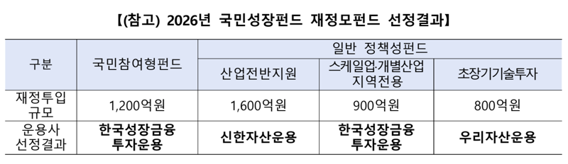 분야별로는 일반 국민이 투자에 참여하는 ‘국민참여형펀드(1200억원)’와 스케일업·지역전용 등 ‘집중지원(900억원)’ 분야에 한국성장금융투자운용이 선정됐다. 기관투자자 자금을 모집하는 일반 정책성펀드 중 ‘산업전반지원(1600억원)’ 분야는 신한자산운용이, ‘초장기기술투자(800억원)’ 분야는 우리자산운용이 각각 담당한다.