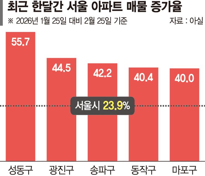 특히 강남3구와 한강벨트를 중심으로 매물이 쌓이기 시작했다. 자치구별로 보면 성동구가 지난달 25일 1236건에서 이달 25일 1924건으로 55.7%(688건) 증가해 가장 높은 증가율을 보였다. 이어 △광진구 44.5%(368건) △송파구 42.2%(1534건) △동작구 40.4%(510건) △마포구 40.0%(569건) 순이었다.