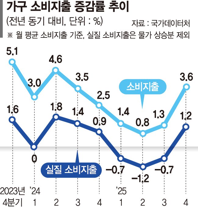 서지현 국가데이터처 가계수지동향과장은 "지난해 가계의 실질 소비 지출이 2020년 이후 처음 마이너스로 전환했다"면서 "가계의 명목지출은 늘었으나 오른 물가 영향으로 실질 지출은 줄어든 것"이라고 말했다.