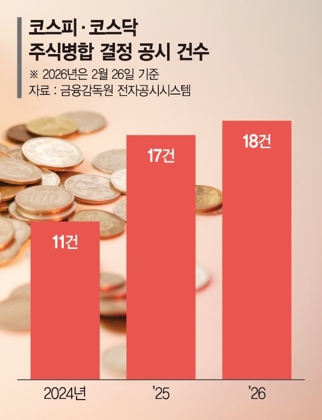 26일 금융감독원 전자공시시스템에 따르면 이달 들어 주식병합 결정을 공시한 코스피·코스닥 기업은 18곳에 달한다. 주식병합 공시 건수가 지난 2024년 11건, 2025년 17건이었던 점을 감안하면 불과 한 달 만에 지난해 연간 수치를 넘어선 것이다.