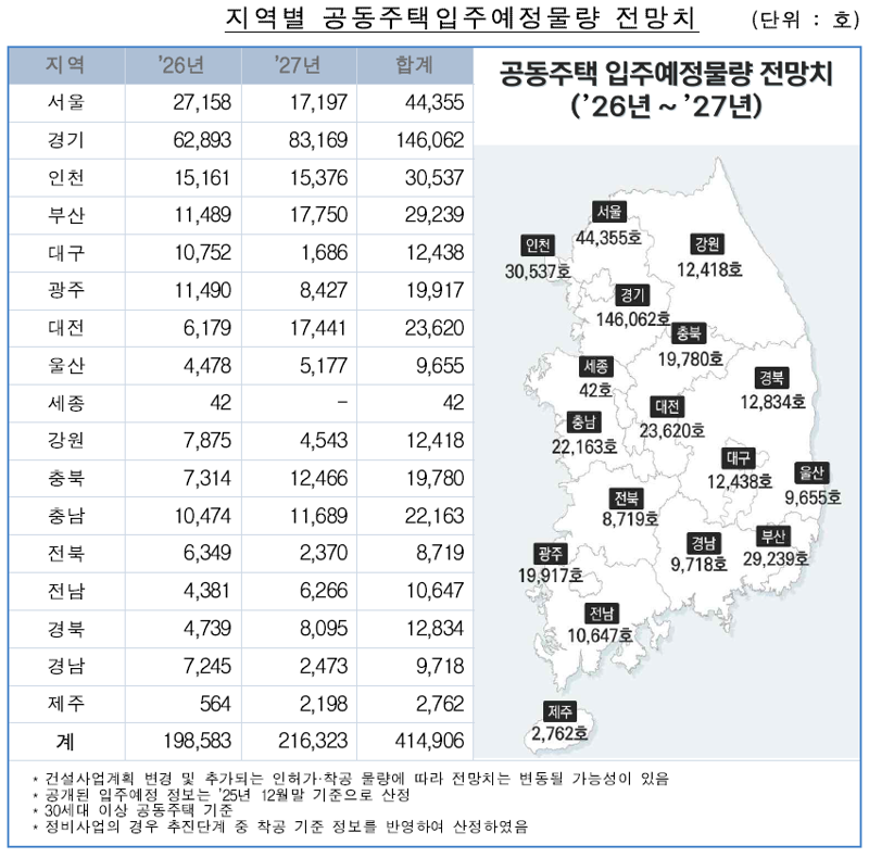 27일 한국부동산원과 부동산R114는 공동으로 2026년 1월부터 2027년 12월까지 향후 2년간의 공동주택 입주예정물량 정보를 발표했다.