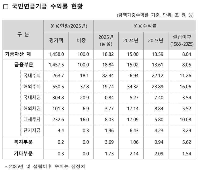 기금운용본부는 “AI·반도체 중심의 기술주 강세와 자본시장 관련 정부 정책에 대한 기대감이 국내 증시를 끌어올리면서 기금 전체 운용 수익률을 견인했다”고 분석했다. 해외주식 역시 미 관세정책 불확실성 속에서도 기술주들의 견고한 실적에 힘입어 19.74%의 수익을 냈다.