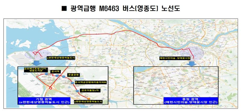M6463번 노선은 e편한세상영종하늘도시를 기점으로 운서역과 인천국제공항고속도로, 올림픽대로 등을 경유해 강남역과 양재꽃시장 일대를 연결하는 광역급행버스이다. M6463번 버스는 오는 28일 오전 5시 첫차를 시작으로 본격 운행에 들어간다.
