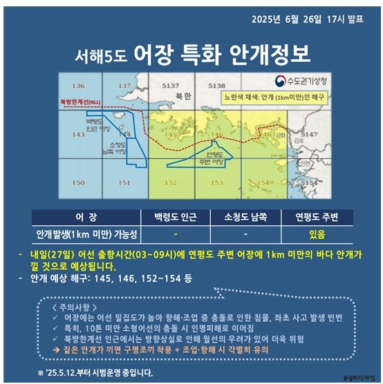 ‘서해5도 어장 특화 안개정보’는 서해5도 7개의 어장을 바다 안개 발생 특성에 따라 ‘백령도 인근, 소청도 남쪽, 연평도 주변’의 세 구역으로 나누고, 구역별로 어선 출항 시간(오전 3~9시)에 1km 미만의 안개가 낄 것이 예상되면 전날 오후 5시경 관련 정보를 제공한다. 이 서비스는 ‘서울·인천·경기도 날씨해설’, 수도권기상청 누리집과 인스타그램, 해양기상정보포털을 통해 제공된다.