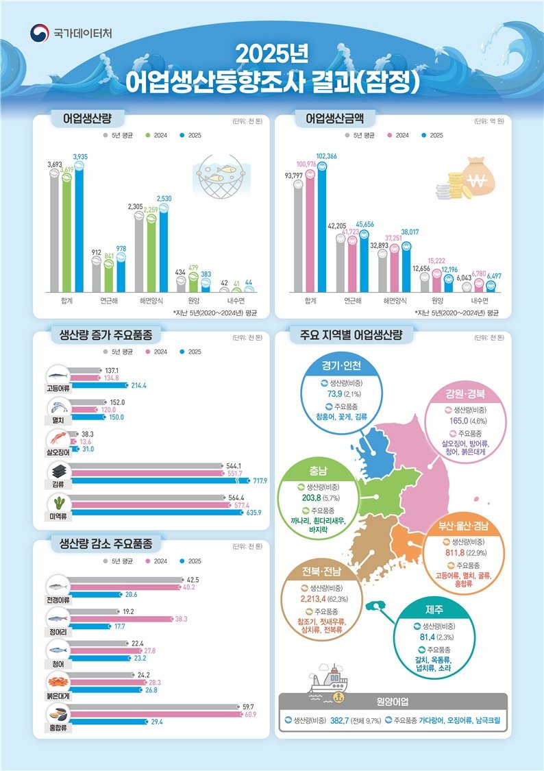 국가데이터처가 27일 발표한 '2025년 어업생산동향조사 결과(잠정)'에 따르면, 어업생산량은 지난해 393만5000t으로 전년 대비 31만6000t(8.7%) 증가했다. 생산금액은 10조2366억원으로 전년보다 1389억원(1.4%) 증가했다. 처음 10조원을 넘겼던 전년에 이어 증가세를 유지하며 역대 최대치를 경신했다.