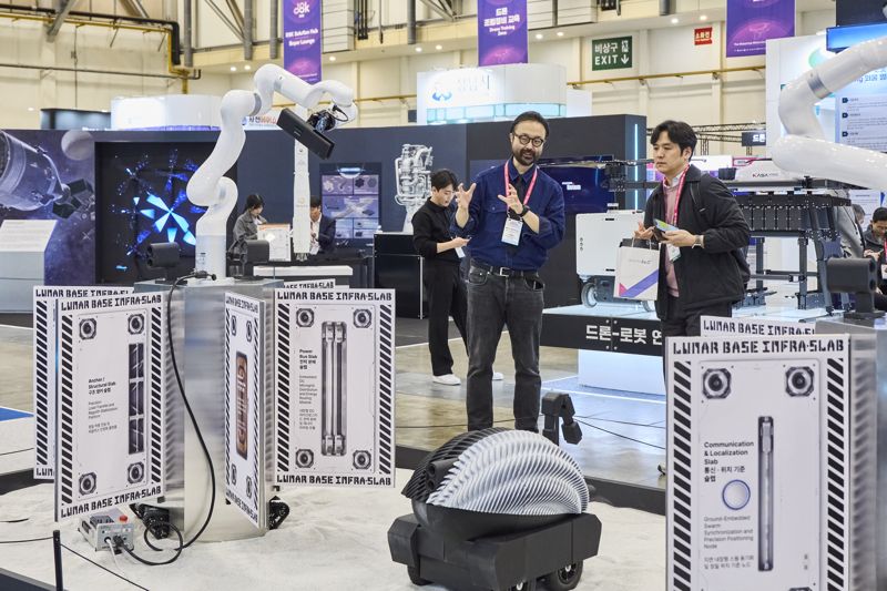 3일 우주항공청과 벡스코 등에 따르면 우선 '달 탐사 로보'를 선보인 베이스앤파워시티는 달 기지를 대비한 첨단 기술로 눈길을 끌었다. 양자컴퓨팅 기반 로봇 제어시스템뿐만 아니라 멀티 에이전트 협업 로봇(UGV·로봇암)도 전시했다. 미래 달 기지 건설을 위한 다양한 기술들이다. 이 회사는 로봇 아키텍처 설계 플랫폼과 빛 기반 우주·장거리 통신 시스템도 보유하고 있다는 설명이다.