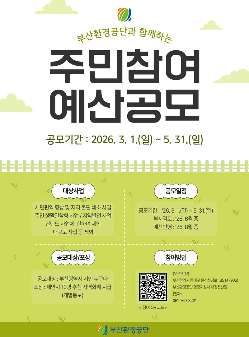 공단 이근희 이사장은 “주민참여예산은 시민의 다양한 목소리를 기관 운영에 직접 반영하는 소통 창구”라며 “주민 생활 속 각종 불편을 개선하는 실질적인 사업이 발굴될 수 있도록 시민 여러분의 관심과 적극적인 참여를 바란다”고 당부했다.