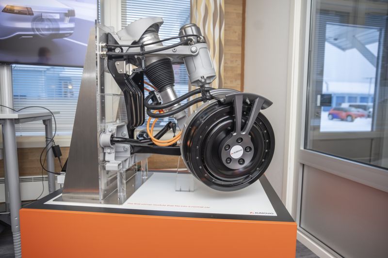얼어붙은 호수 위, 차량의 엔진룸을 열자 엔진도, 변속기도, 드라이브샤프트도 보이지 않았다. 그 자리를 채운 것은 바퀴 안에 들어간 모터와, 모터에 달라붙은 브레이크 유닛이다.