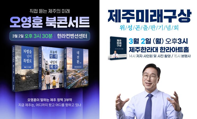오영훈 지사는 3월 2일 오후 3시 30분 제주한라대학교 한라컨벤션센터에서 출판기념회를 개최한다. 위성곤 의원도 같은 날 오후 3시 제주한라대학교 한라아트홀에서 행사를 연다. 두 장소는 직선거리 약 150m에 불과하다.