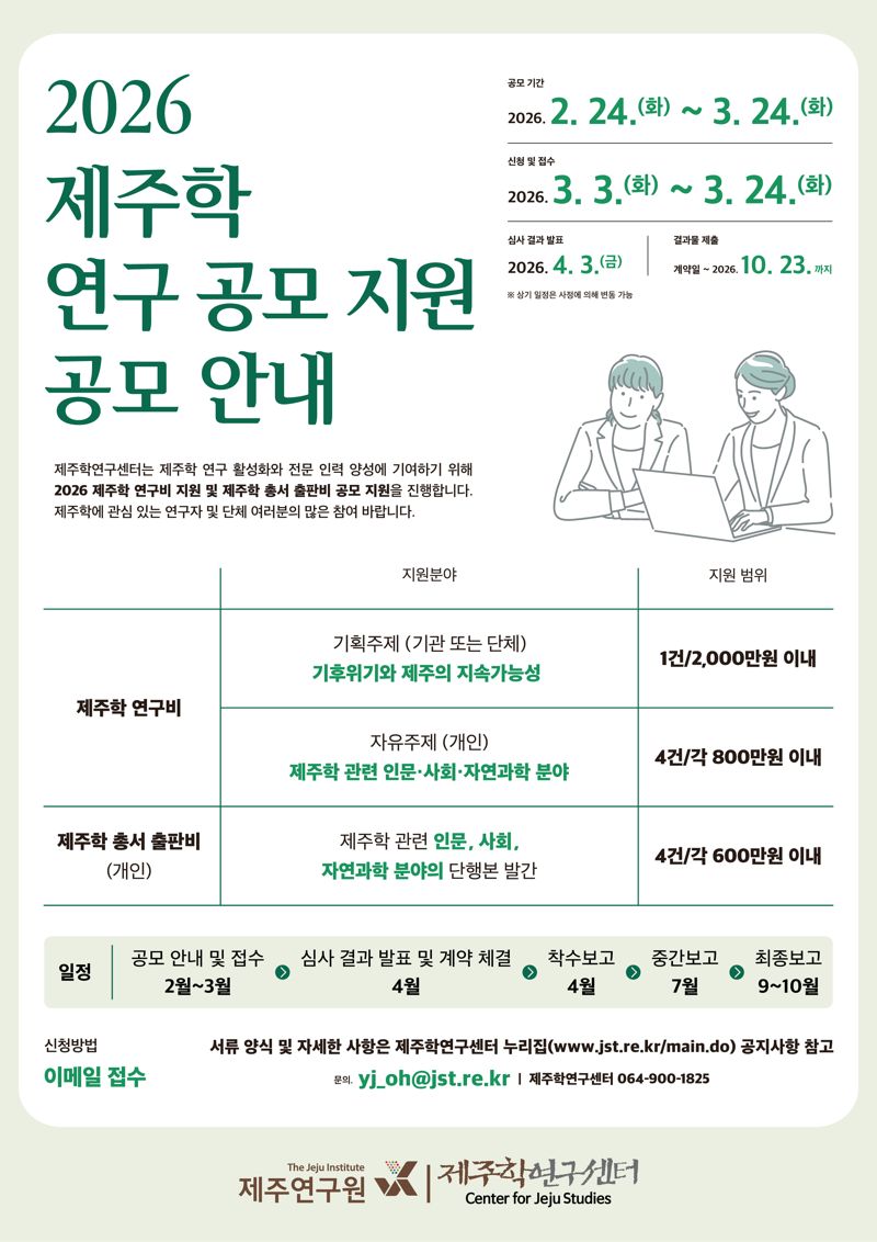 공모 안내는 2월 24일부터 진행되며, 신청 접수는 3월 3일부터 3월 24일 오후 5시까지 이메일로 받는다. 자세한 사항과 서류 양식은 제주학연구센터 누리집(www.jst.re.kr/main.do) 공지사항에서 확인할 수 있다. 문의 064-900-1825.