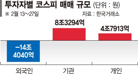 1일 한국거래소에 따르면 지난달 13일부터 27일까지 외국인은 코스피 시장에서 8거래일 연속 순매도에 나서며 누적 14조4040억원을 팔아치웠다. 같은 기간 기관은 8조3294억원을 순매수하며 수급을 주도했고, 개인도 4조7913억원을 사들이며 매수 흐름에 동참했다.
