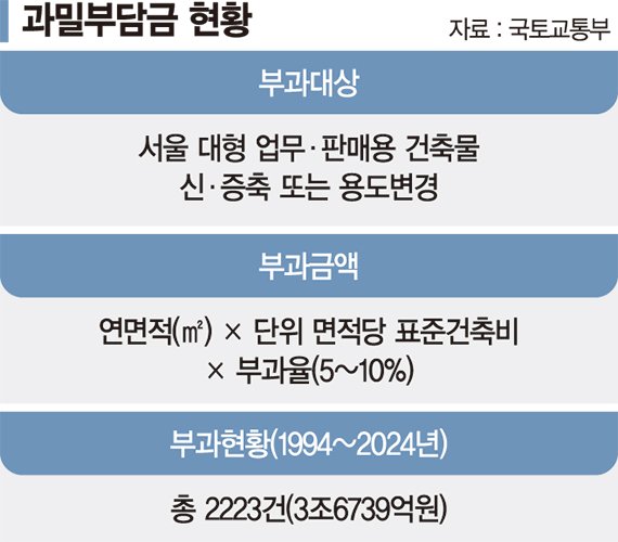 1일 업계에 따르면 국토교통부는 최근 '수도권 과밀억제를 위한 과밀부담금 제도 개선방안 연구용역'을 발주했다. 과밀부담금은 서울에서 대형 업무·판매용 건축물을 신·증축 또는 용도변경시 표준건축비의 5~10%에 해당하는 금액을 부과하는 것이다.