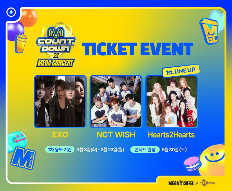 [파이낸셜뉴스] 메가MGC커피는 오는 5월 30일 인천 영종도 인스파이어 아레나에서 'M COUNTDOWN X MEGACONCERT(메가콘서트)'를 개최하는 가운데 1차 가수 라인업을 공개했다고 3일 밝혔다.