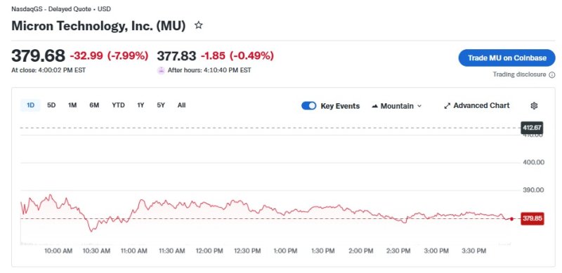 3일(현지 시각) 뉴욕증시 정규장에서 마이크론은 7.99% 폭락한 379.68달러를 기록한 뒤 시간외거래에서도 0.49% 하락하고 있다.