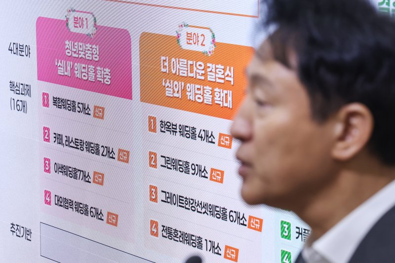 또 남산·한강 등 주요 명소 예식장 가운데 결혼식이 없는 시간대를 활용해 웨딩 사진 촬영 장소를 제공한다. 오는 5월 이후 해당 장소에서 '첫 웨딩 촬영'을 진행하는 예비부부에게는 촬영비와 공간 연출을 지원한다. '더 아름다운 결혼식' 장소에서 '첫 예식'을 올리는 커플에게는 최대 300만 원의 연출비를 지원한다.