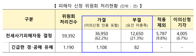 심의 대상 가운데 406건은 피해 요건을 충족하지 못해 부결됐고, 137건은 보증보험 가입이나 최우선변제금 등을 통해 보증금 전액 반환이 가능한 것으로 판단돼 적용 대상에서 제외됐다.