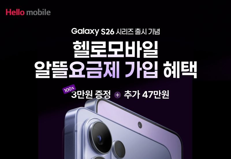 갤럭시 S26 시리즈 구입 고객 누구나 참여 가능하다. 헬로모바일 직영몰에서 월 5000원 이상 유심∙이심 요금제에 가입하고, 구입한 단말에 유심을 장착해 고객센터에 기기 등록을 완료하면 된다. 이심은 기기에서 활성화를 완료하면 된다.