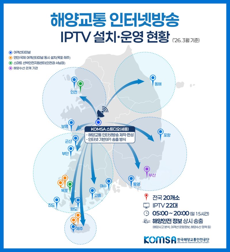 전국 여객선터미널 등 20개소에 설치된 IPTV티비와 송출장치를 통해 월간 해양사고 분석과 바다 상식, 여객선 운항정보 및 안전수칙 등 다양한 해양안전 정보가 상시 송출되는 구조로 운영된다.