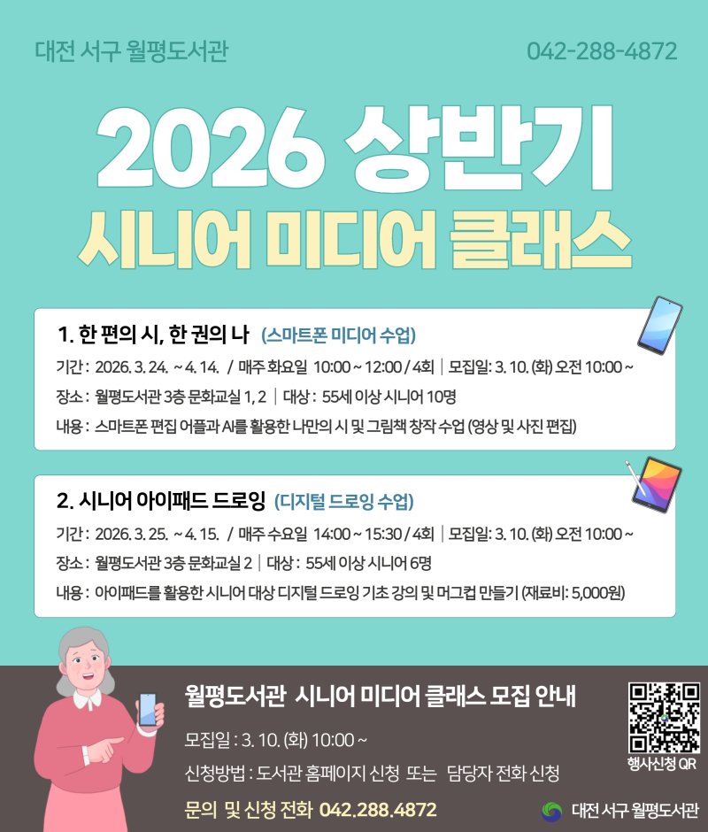수강 신청은 3월 10일 오전 10시부터 월평도서관 홈페이지에서 55세 이상을 대상으로 선착순 접수한다. 자세한 내용은 월평도서관 홈페이지 '행사·강좌 신청' 메뉴나 전화 문의를 통해 확인할 수 있다.