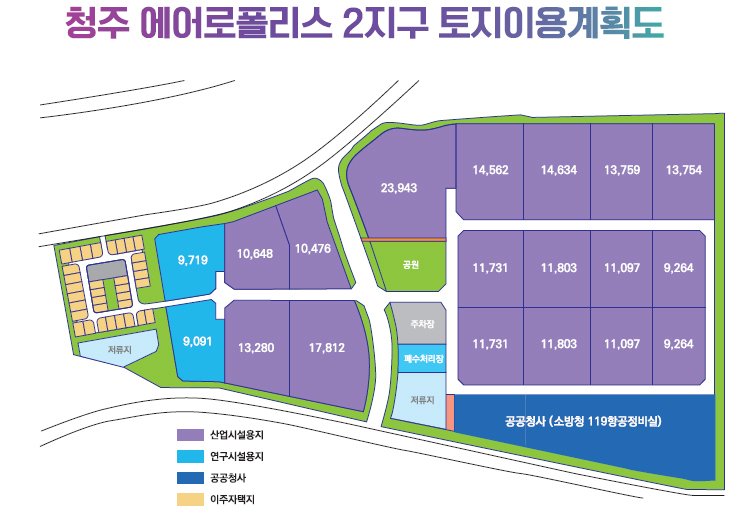 청주 에어로폴리스 1지구와 2지구는 조성이 완료돼 항공 관련 기업의 입주가 가능한 상태이며 3지구 개발도 추진 중이다.
