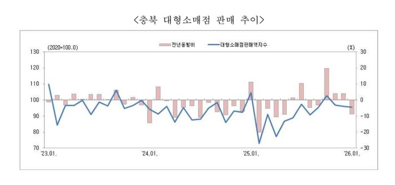4일 충청데이터청의 1월 산업활동동향을 보면 도내 대형 소매점 판매액지수는 95.5로 지난해 같은 달보다 8.8% 감소했다.
