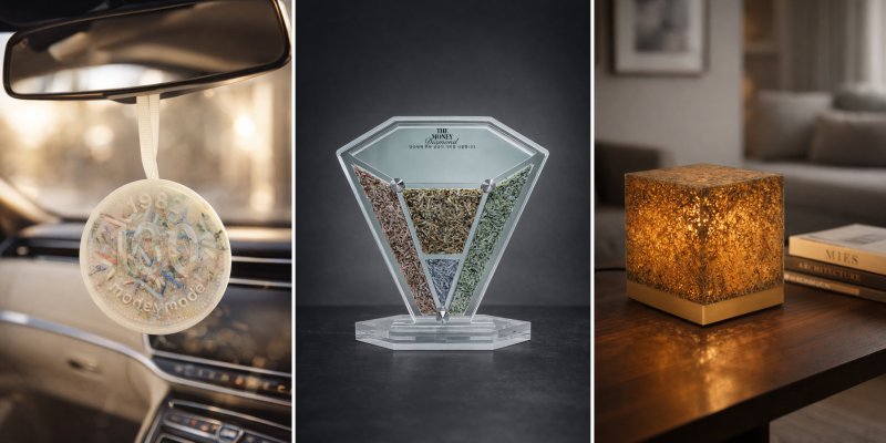 선정된 제품은 파쇄된 지폐를 투명한 아크릴에 담은 '돈상패', 화폐 부산물 큐브를 투과하는 빛으로 복을 더하는 '돈조명', 향기 제품인 '돈방향제'다.