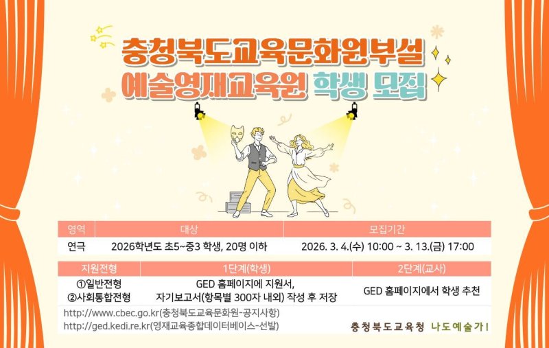 (청주=뉴스1) 엄기찬 기자 = 충북교육문화원은 부설 예술영재교육원이 연극을 통해 잠재된 예술 감수성을 발견하고 창의적인 자기표현 역량을 키울 2026학년도 신입생을 모집한다고 4일 밝혔다.