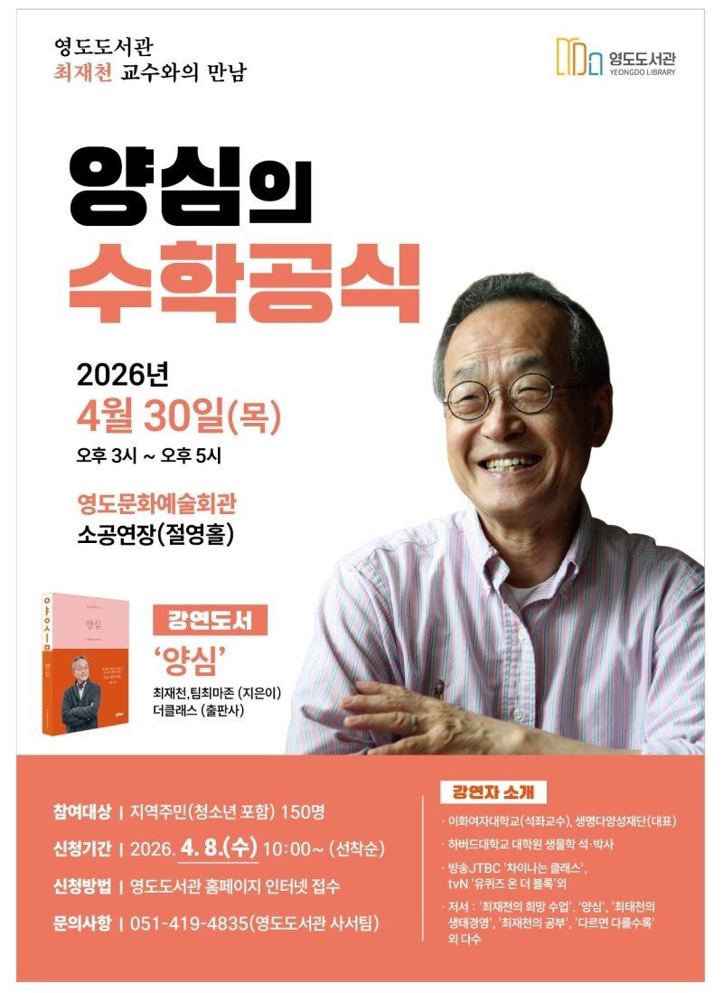 부산 영도도서관은 다음 달 30일 최재천 교수를 초청해 '양심의 수학공식'을 주제로 영도문화예술회관 소공연장(절영홀)에서 특별 강연회를 개최한다고 4일 밝혔다.