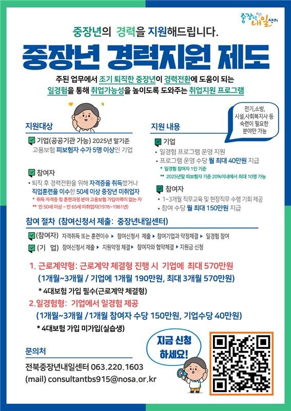 '중장년경력지원제'는 주된 업무에서 퇴직 후 경력 전환을 위해 자격을 취득했거나 훈련을 이수한 50대 이상 중장년에게 ▲현장실무경험 ▲직무 멘토링·마인드 교육 ▲디지털 역량 교육 등을 지원해 취업 가능성을 높여주는 취업지원 프로그램이다.