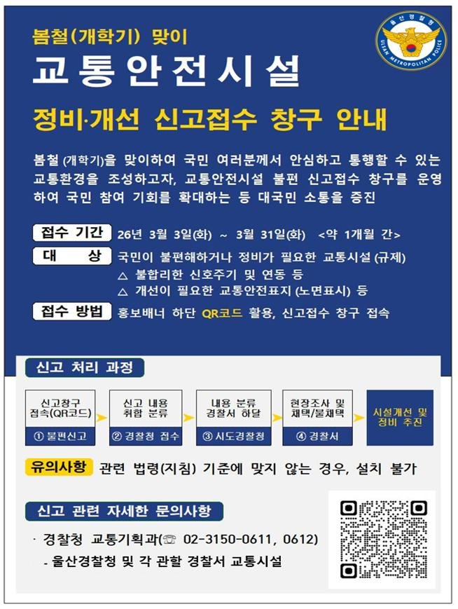 [울산=뉴시스] 박수지 기자 = 울산경찰청과 자치경찰위원회는 시민이 안심하고 통행할 수 있는 교통환경 마련을 위해 '교통안전시설 정비·개선 신고창구'를 운영한다고 4일 밝혔다.