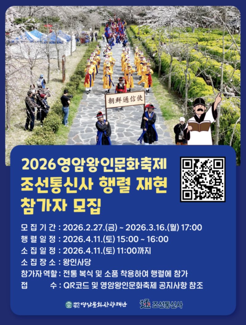 영암문화관광재단은 조선통신사 행렬에 참여할 참가자를 100여명을 모집한다. 자세한 사항은 영암왕인문화축제 공식 누리집에서 확인할 수 있다.