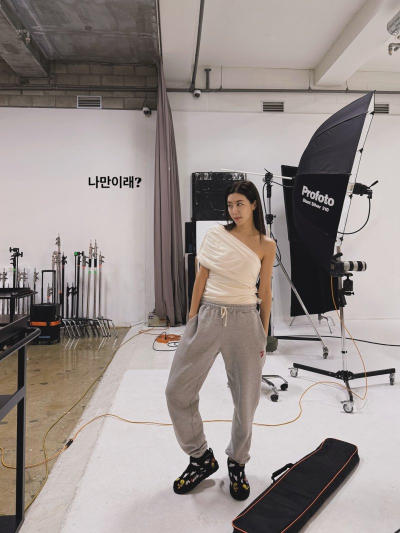 하지만 이어진 사진 속 박한별은 우아한 상의에 매치되지 않는 회색 트레이닝 바지를 입고 포즈를 취하고 있어 의아함을 자아낸다.