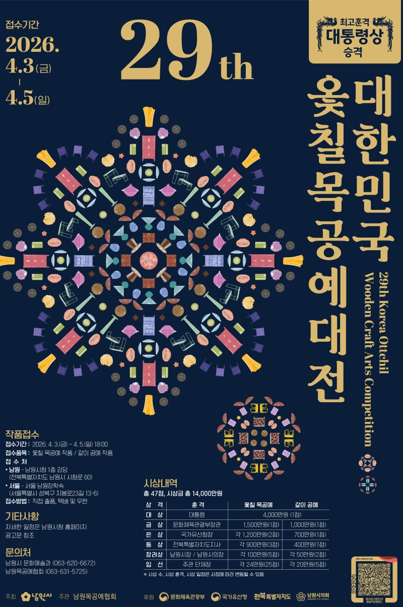올해 제29회 대한민국 옻칠 목공예대전은 시 홈페이지를 통한 사전 홍보가 시작됐다. 출품기간은 오는 4월3일부터 5일까지이며 남원시청 강당과 서울남원장학숙에 옻칠 목공예와 갈이 공예 등 2개 분야의 작품을 출품할 수 있다.