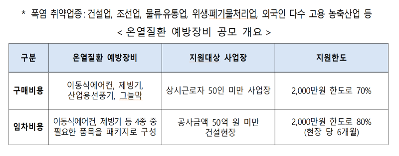 구매지원은 50인 미만 폭염 취약사업장에서 이동식 에어컨 등을 구입할 경우 소요 금액의 70%를 최대 2000만 원 한도 내에서 지원하며, 임차지원은 50억 원 미만의 소규모 건설현장에서 필요한 장비를 패키지로 구성해 임대할 경우, 최대 6개월간 임차비용의 80%를 지원한다.