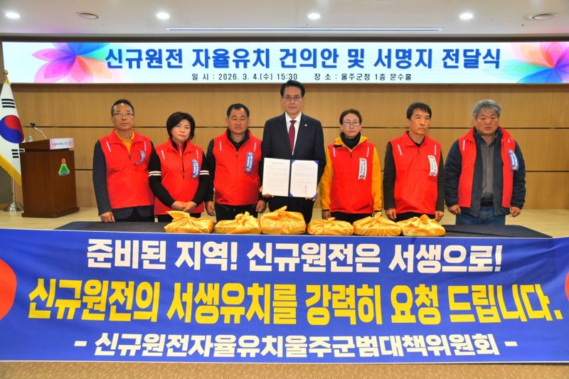 【파이낸셜뉴스 울산=최수상 기자】 신규 원전 자율유치 울주군 범대책위원회가 4일 원전 유치 건의안과 주민 서명지를 울주군청과 군의회에 전달하고 사회적 공감대 형성을 촉구했다.
