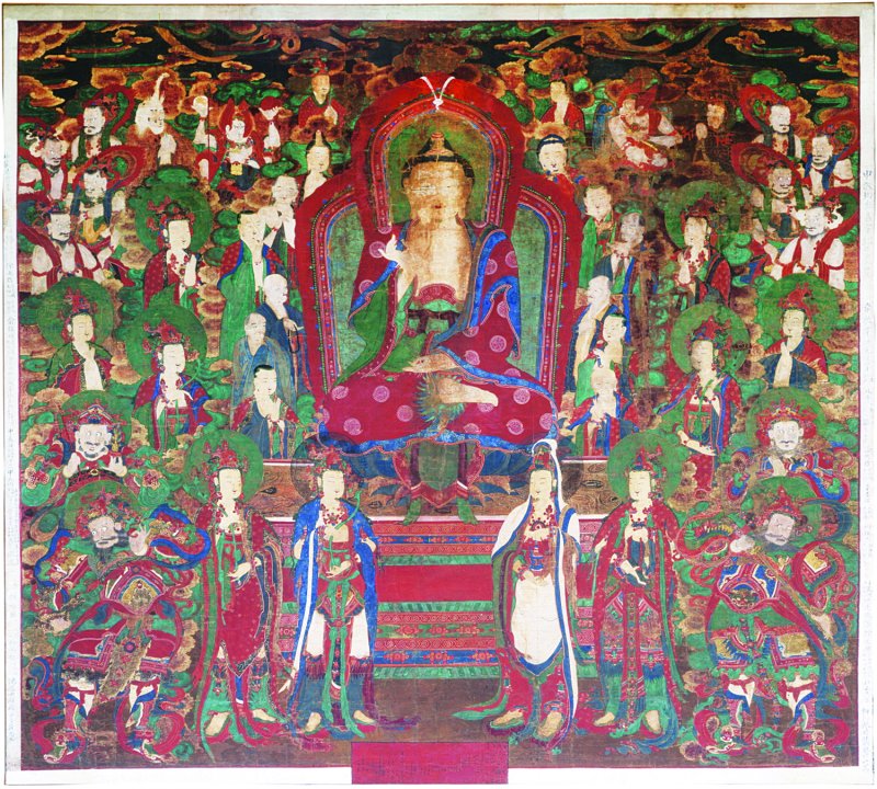 아미타여래설법도는 가로 298㎝, 세로 265㎝의 비단 바탕에 진채색으로 그려졌다.