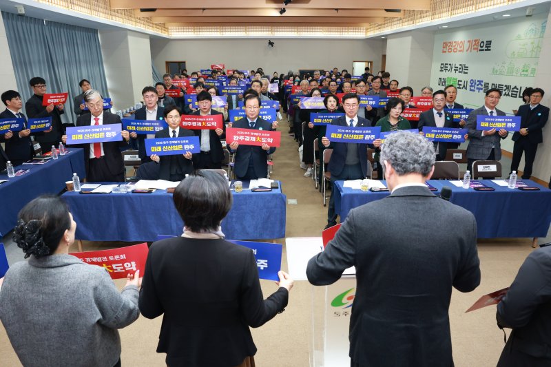[완주=뉴시스] 김민수 기자 = 전북 완주군이 수소와 실물 인공지능(피지컬 AI)등 차세대 신산업으로의 전환을 가속화하고 민생경제를 되살리기 위한 정책 공론의 장을 열었다.