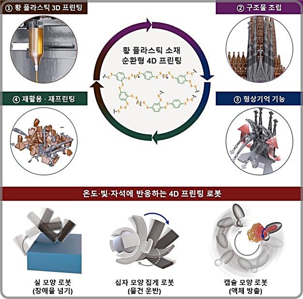 특히 황 플라스틱의 황 함량과 그물구조를 정교하게 조절해 온도나 빛 같은 자극에 모양이 변하는 '형상기억'이 가능한 4D 프린팅 기술을 확보했다. 별도의 장치 없이 소재 자체가 스스로 형태를 바꾸는 지능형 구조체다.